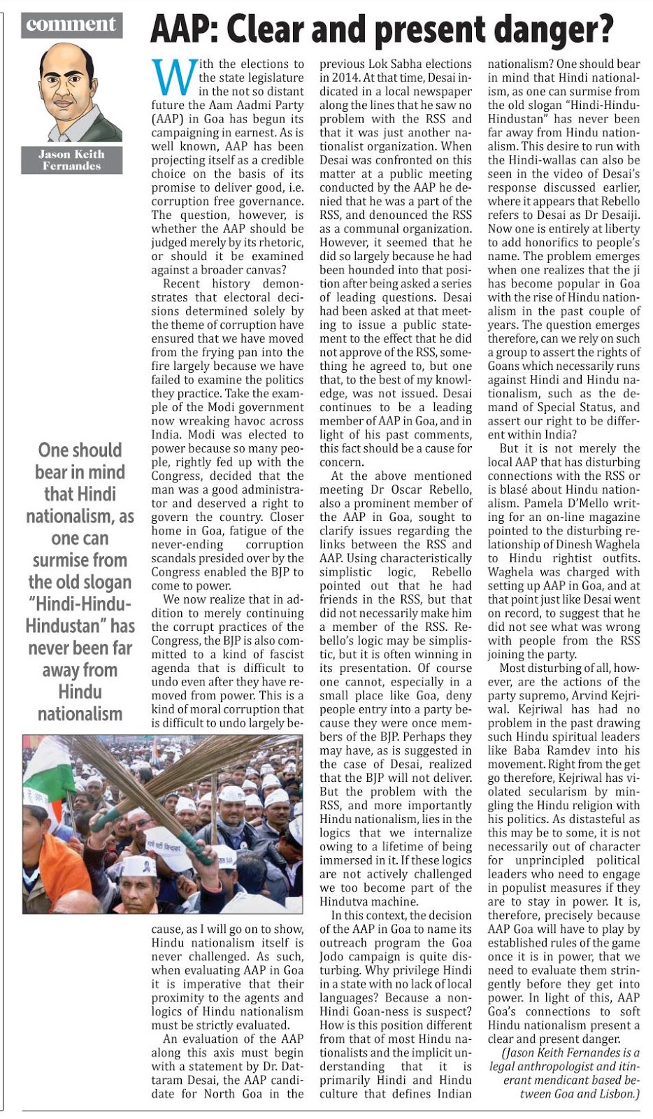 national mark, rather than addressing critical Goan needs.A leaf from Goan history should offer good reason why AAP Goa should heed this caution. In the run-up to the first elections In Goa under Indian rule the Indian National Congress (INC) was extremely confident of a sweeping INC victory in the 1963 elections. Such was its confidence, that as Parag Parobo has pointed out in his book on early post-colonial Goa, the All India Congress General Secretary K. K. Shah announced that the INC did not require any special manifesto for Goa. All of this while tickets were given almost exclusively to individuals from dominant castes. Just as supporters of AAP today dismiss the need for a regional party, so too in 63 the INC was also confident of success because of its national location. And yet the INC experienced a crushing defeat at the polls. Not only did they not gain a single seat from Goa, but in many locations the candidates lost their deposits. The moral of that election was that local issues, not national were critical to electioneering, and secondly that issues of caste justice cannot be ignored and simply dismissed. The result of that election should offer sobering advice for AAP Goa that in many ways could be said to be repeating those mistakes.